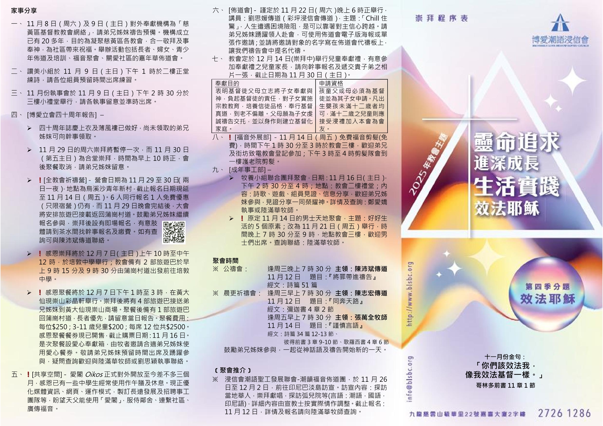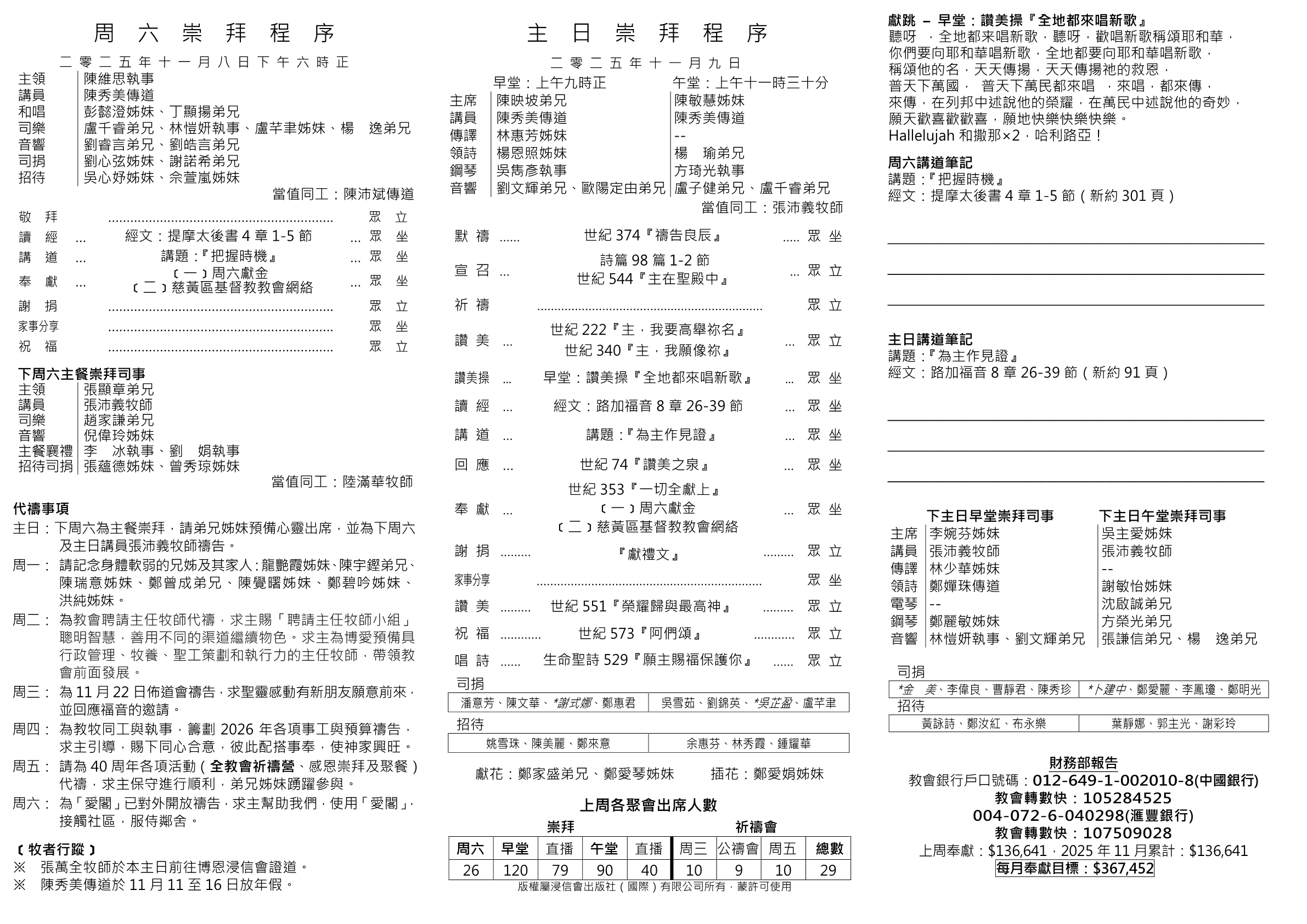 2025年11月9日—主日(早午)堂崇拜,時間:主日早堂:上午九時;午堂:上午十一時三十分