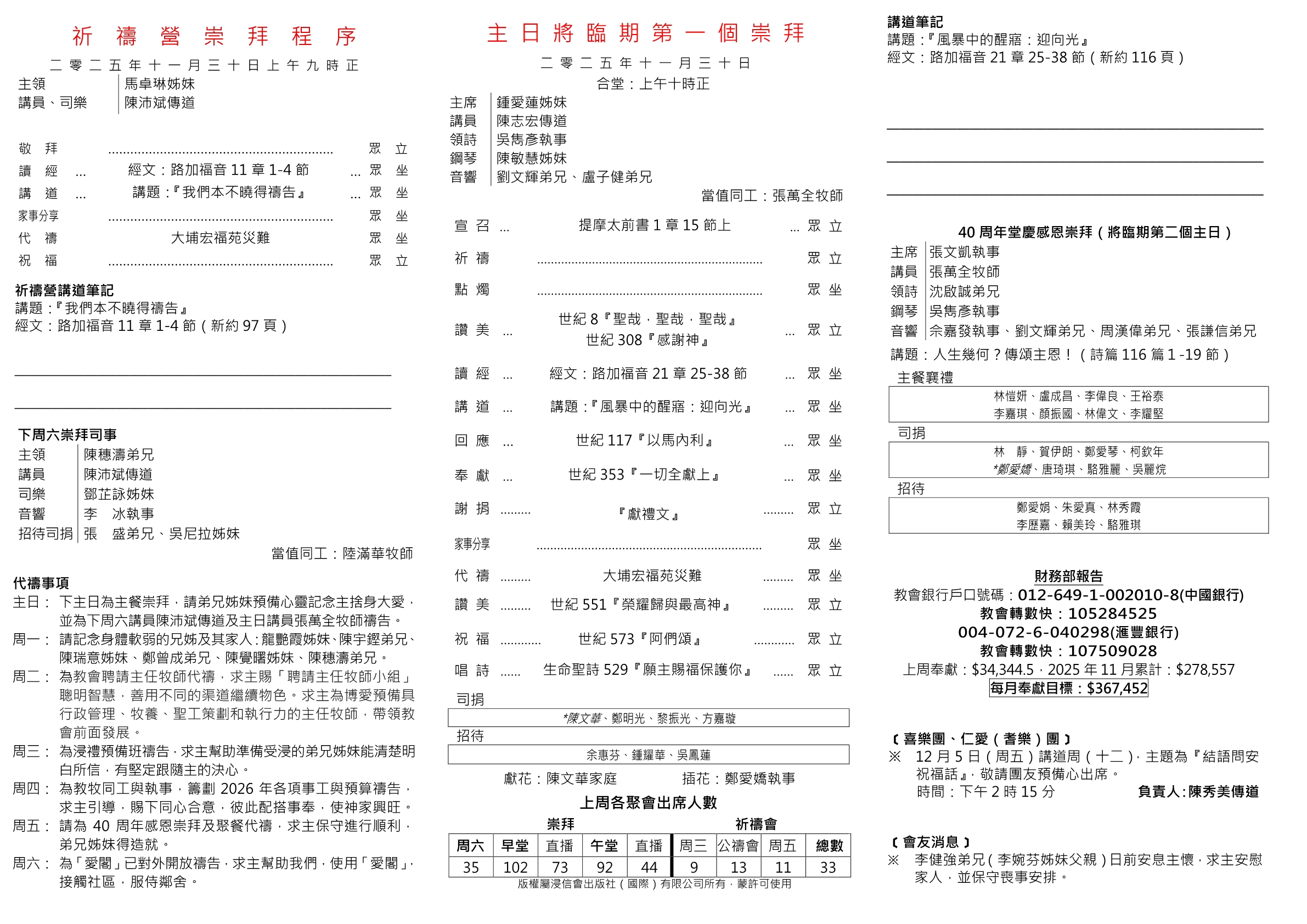 講員:陳志宏傳道 講題:『風暴中的醒寤:迎向光』 講道經文:路加福音21章25-38節 2025年11月30日主日合堂崇拜(將臨期第一個崇拜)程序表 2025年11月30日主日合堂崇拜(將臨期第一個崇拜)程序表