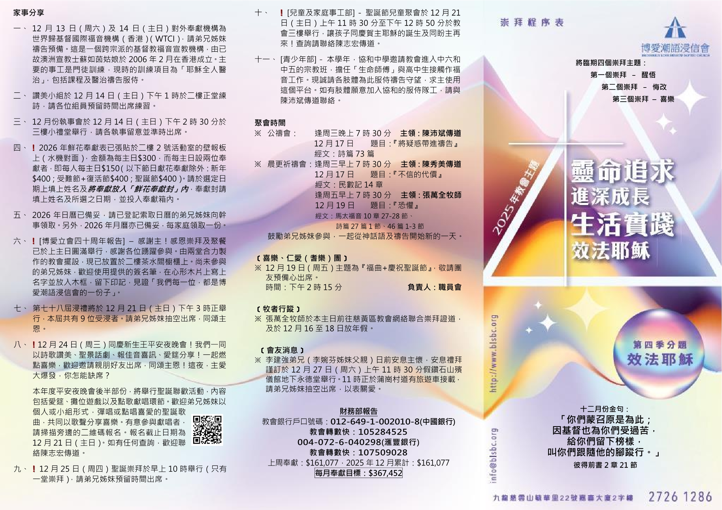 2025年12月14日將臨期第三個 (早午)堂崇拜,時間:主日早堂:上午九時;午堂:上午十一時三十分