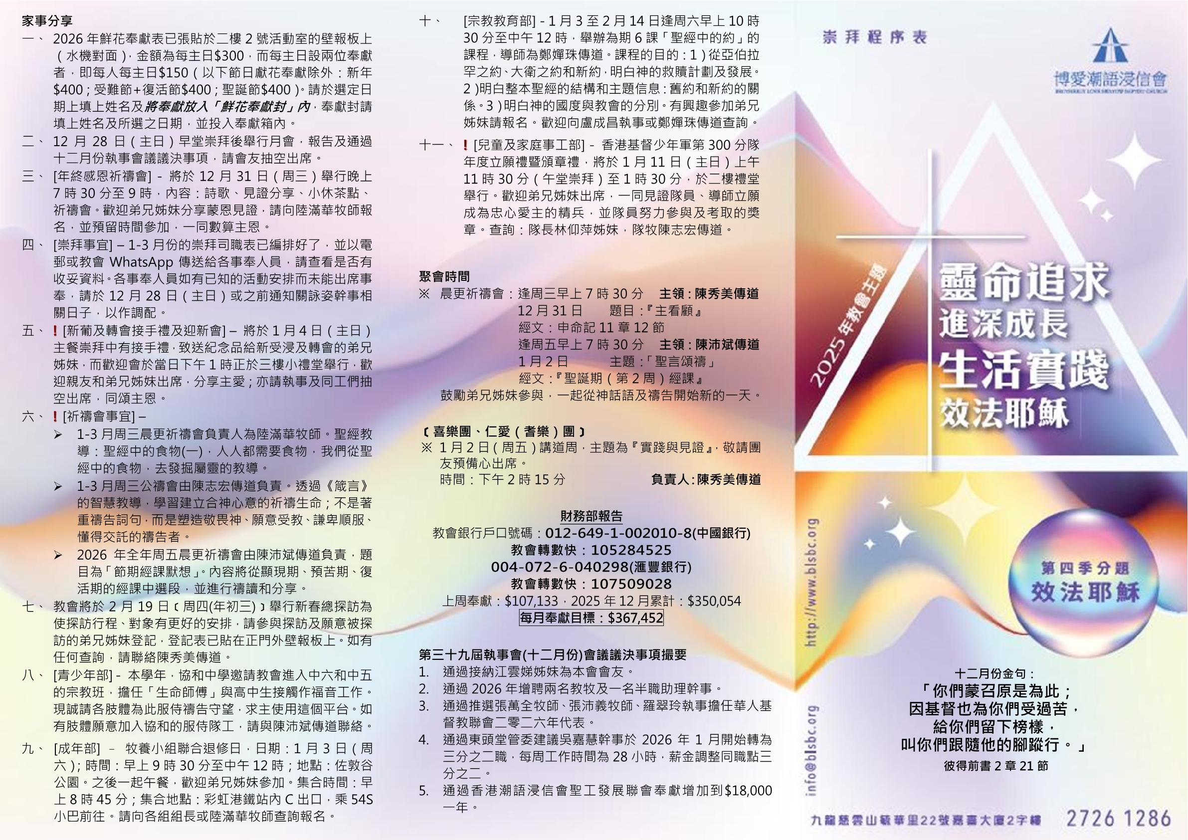 2025年12月28日(早午)堂崇拜,時間:主日早堂:上午九時;午堂:上午十一時三十分