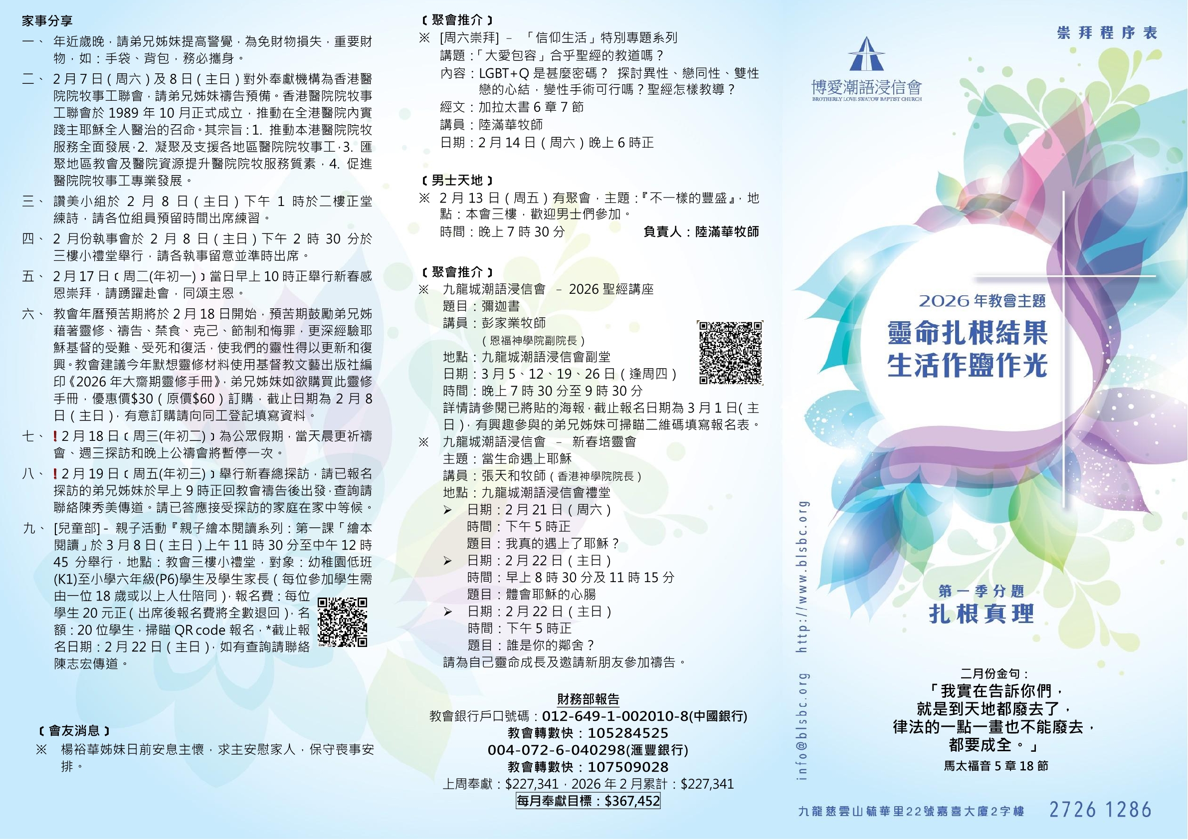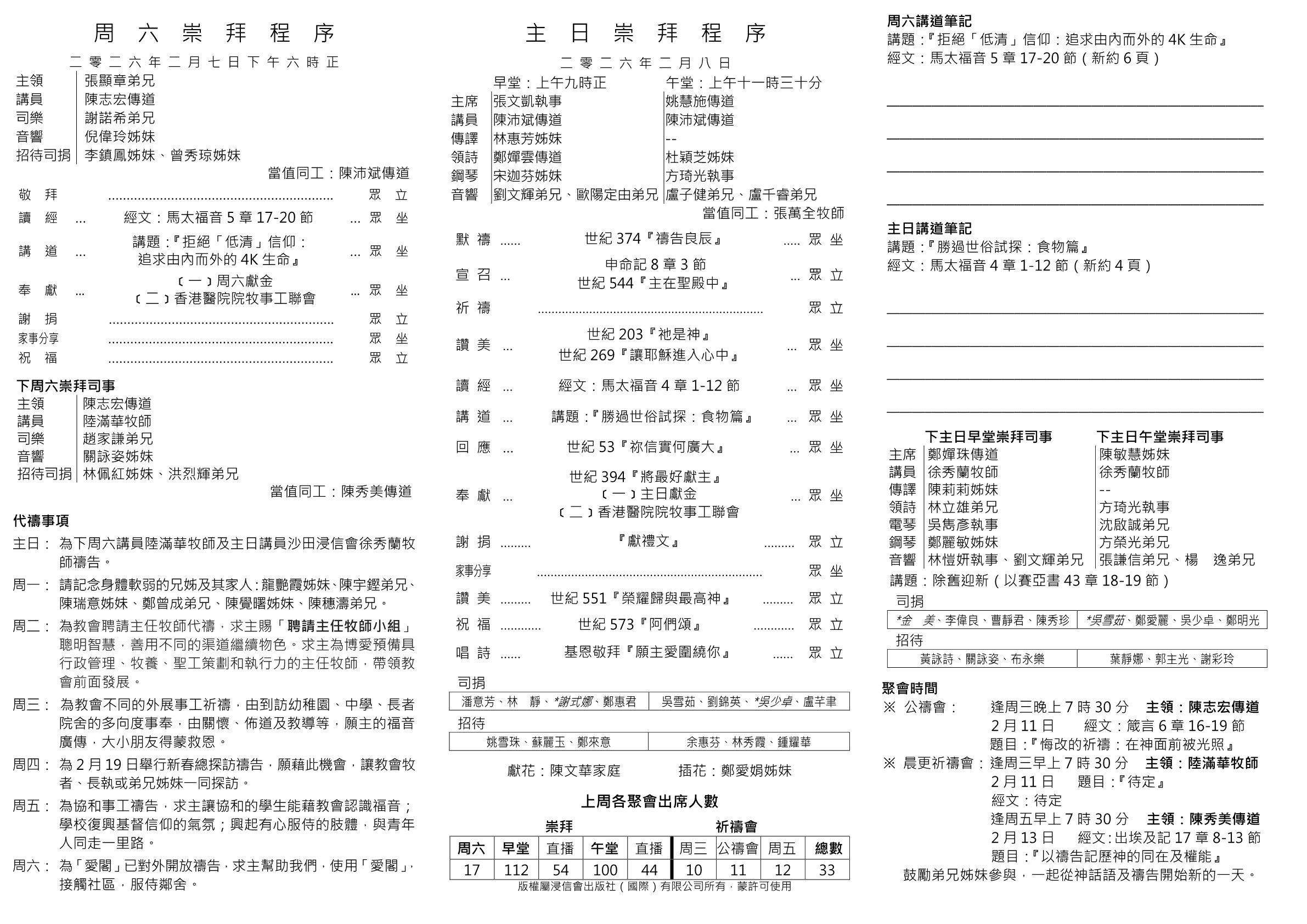 2026年2月8日(早午)堂崇拜,時間:主日早堂:上午九時;午堂:上午十一時三十分