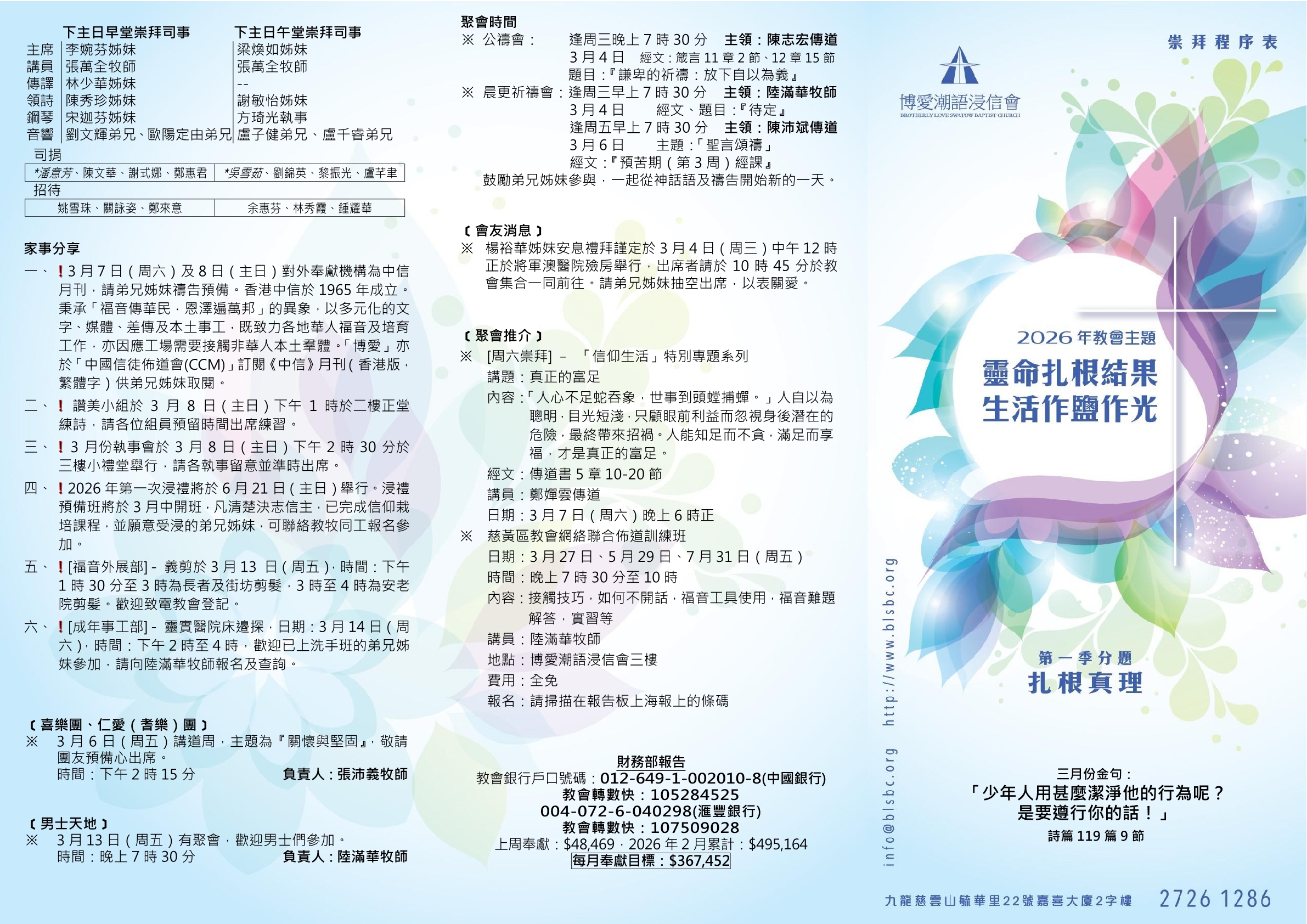 講員:陸滿華牧師 講題:『蒙神喜悅的生命特質--堅貞』 講道經文:馬太福音1章1-3節、創世記22章15-17節 2026年3月1日主日主餐(早午)堂崇拜程序表 2026年3月1日主日主餐 (早午)堂崇拜程序表