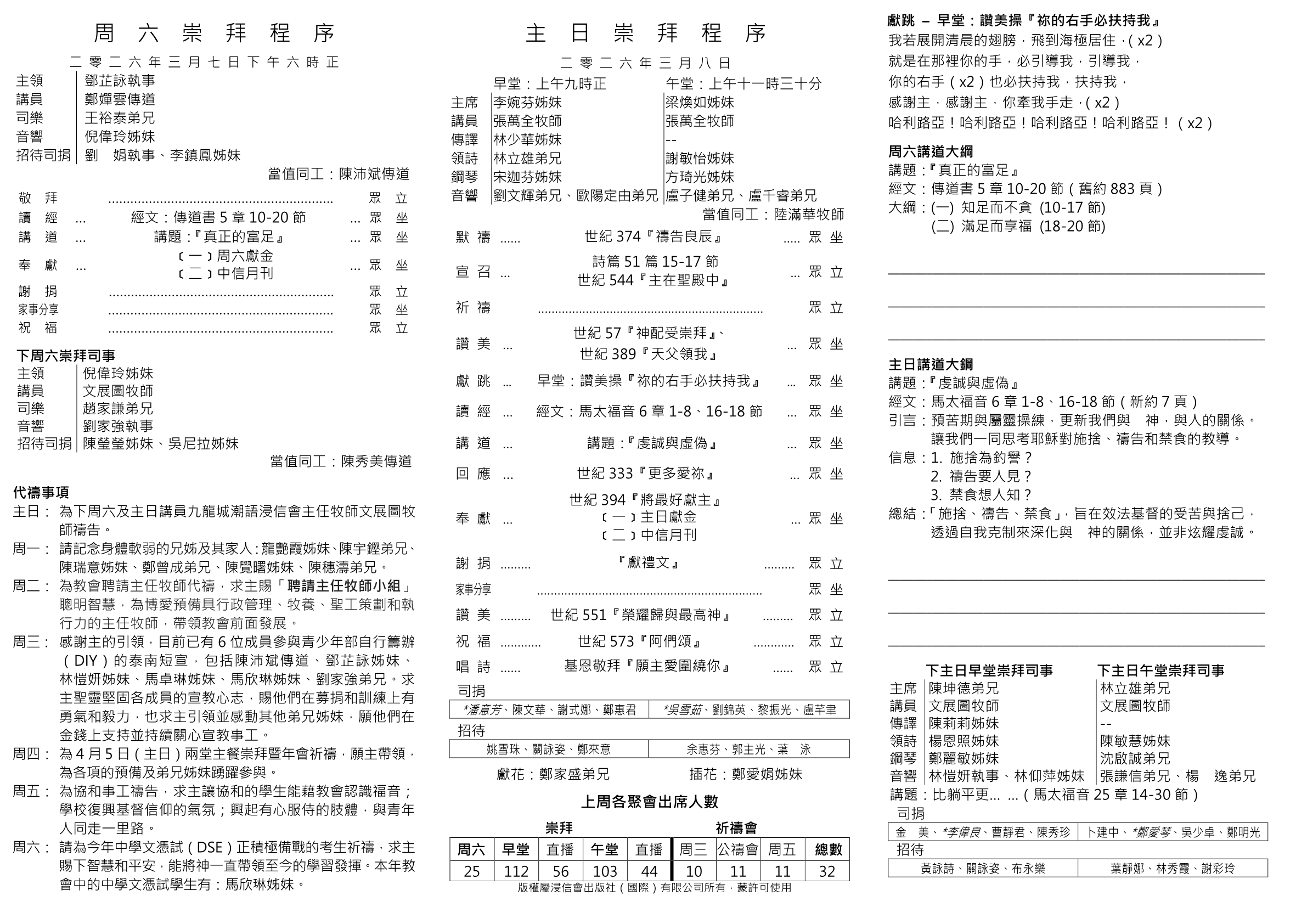 2026年3月8日主日(早午)堂崇拜程序表
