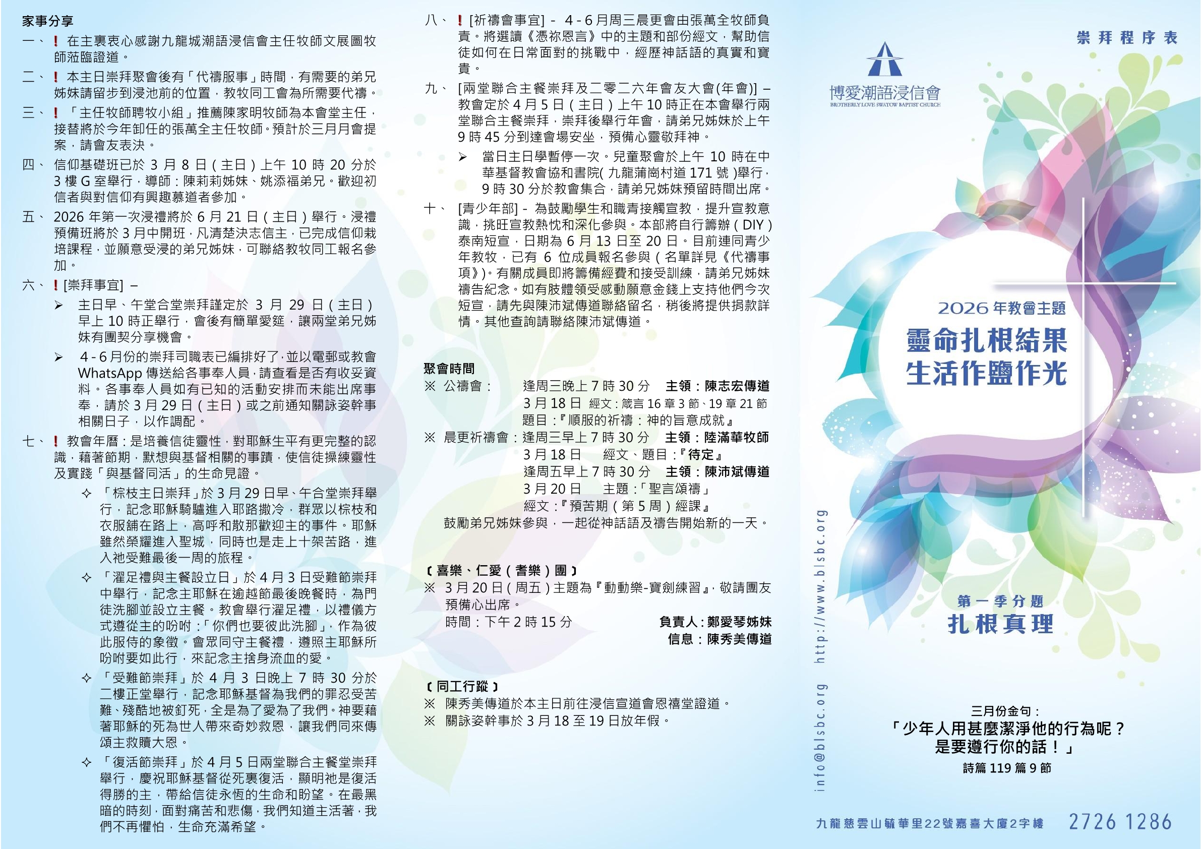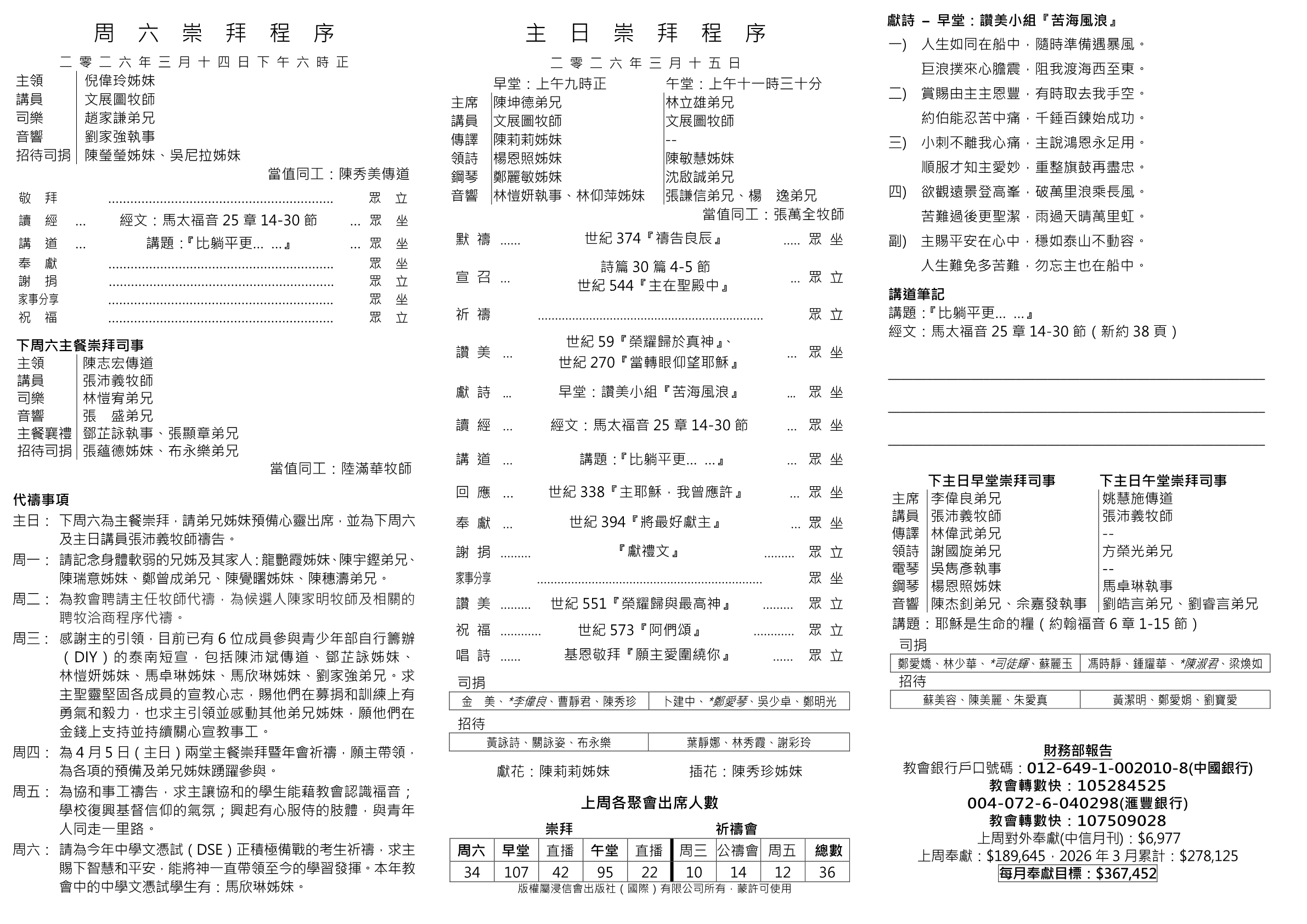 2026年3月15日主日 (早午)堂崇拜,時間:主日早堂:上午九時;午堂:上午十一時三十分