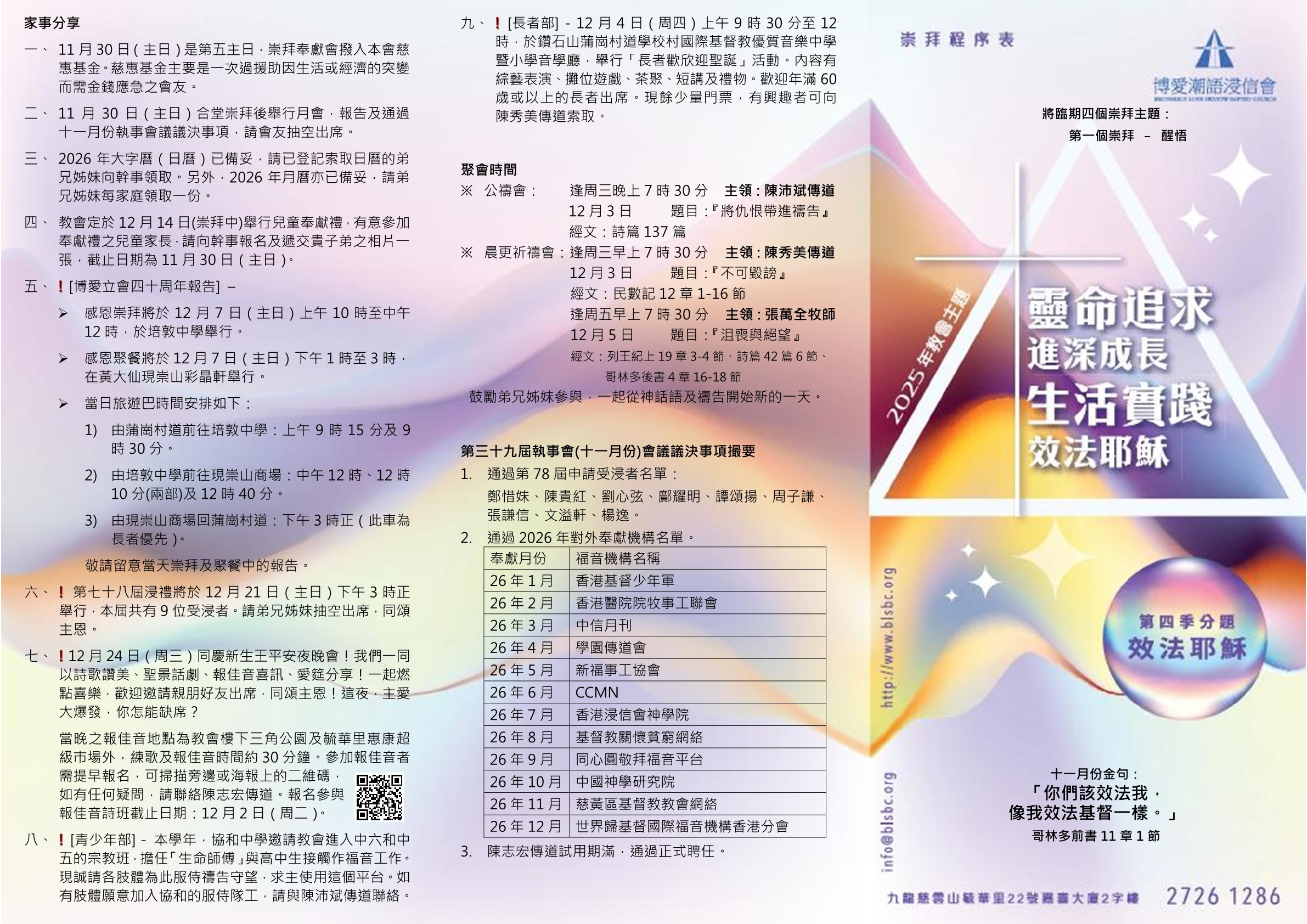 講員:陳志宏傳道 講題:『風暴中的醒寤:迎向光』 講道經文:路加福音21章25-38節 2025年11月30日主日合堂崇拜(將臨期第一個崇拜)程序表 2025年11月30日主日合堂崇拜(將臨期第一個崇拜)程序表