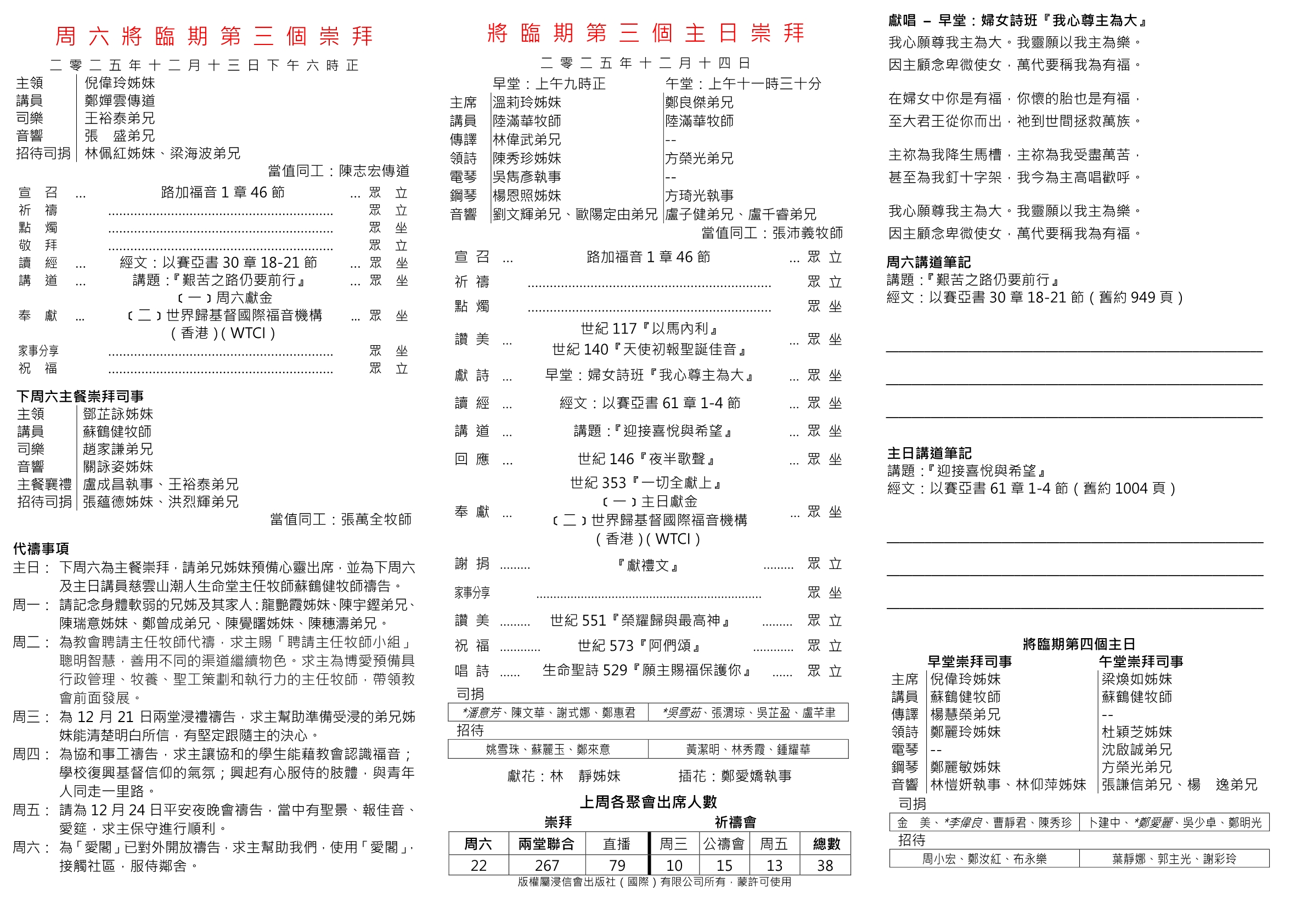 2025年12月14日將臨期第三個 (早午)堂崇拜,時間:主日早堂:上午九時;午堂:上午十一時三十分