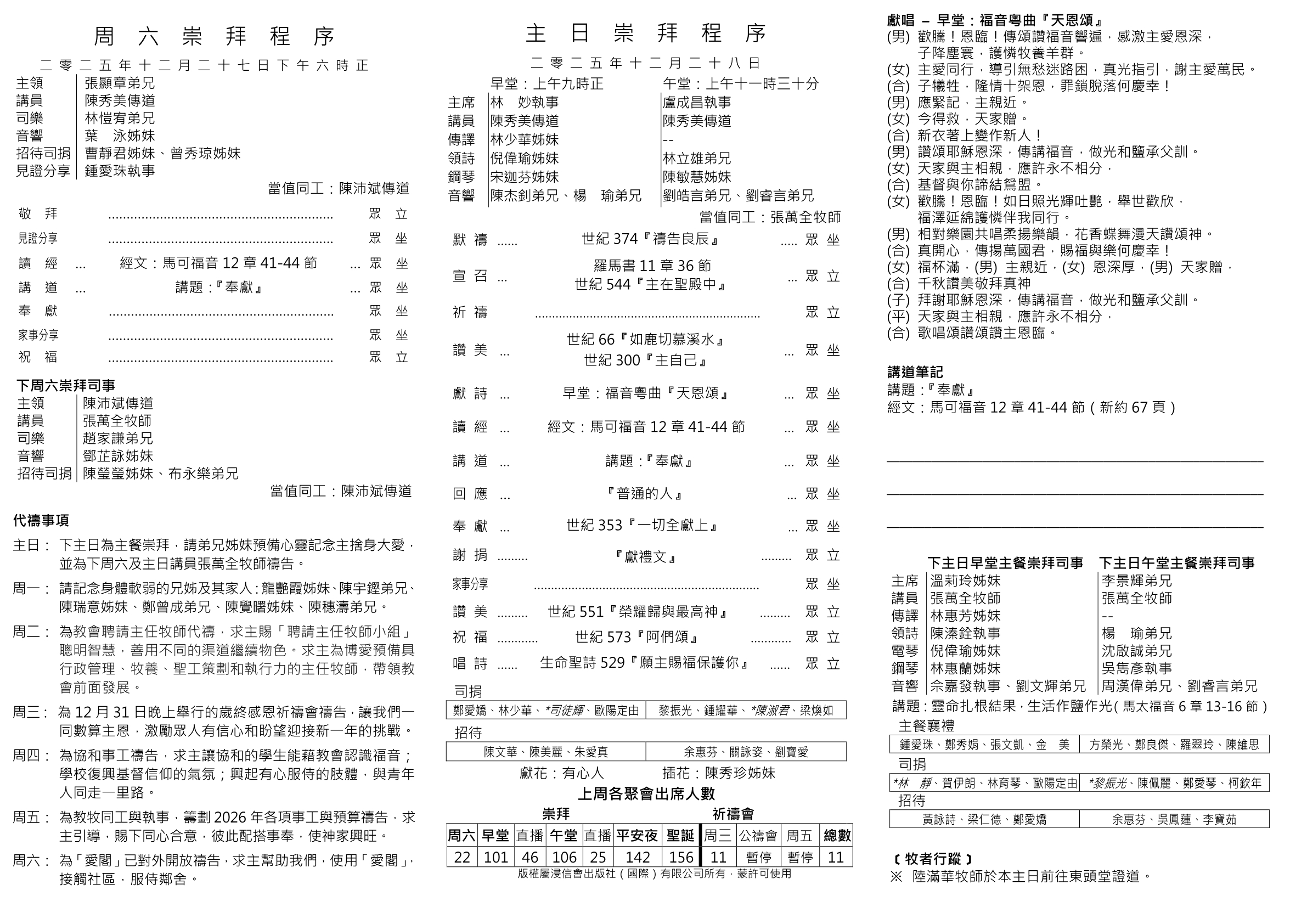 2025年12月28日(早午)堂崇拜,時間:主日早堂:上午九時;午堂:上午十一時三十分