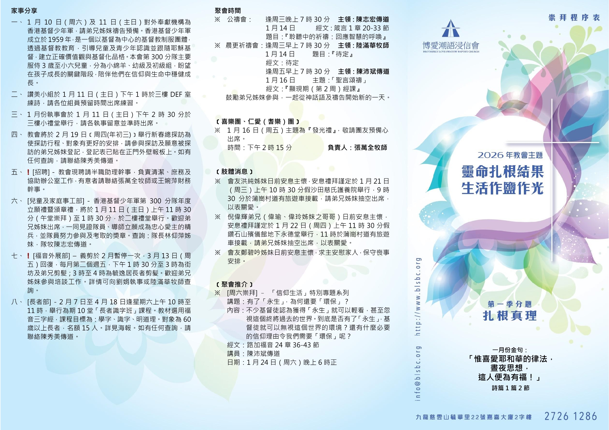 2026年1月11日(早午)堂崇拜,時間:主日早堂:上午九時;午堂:上午十一時三十分