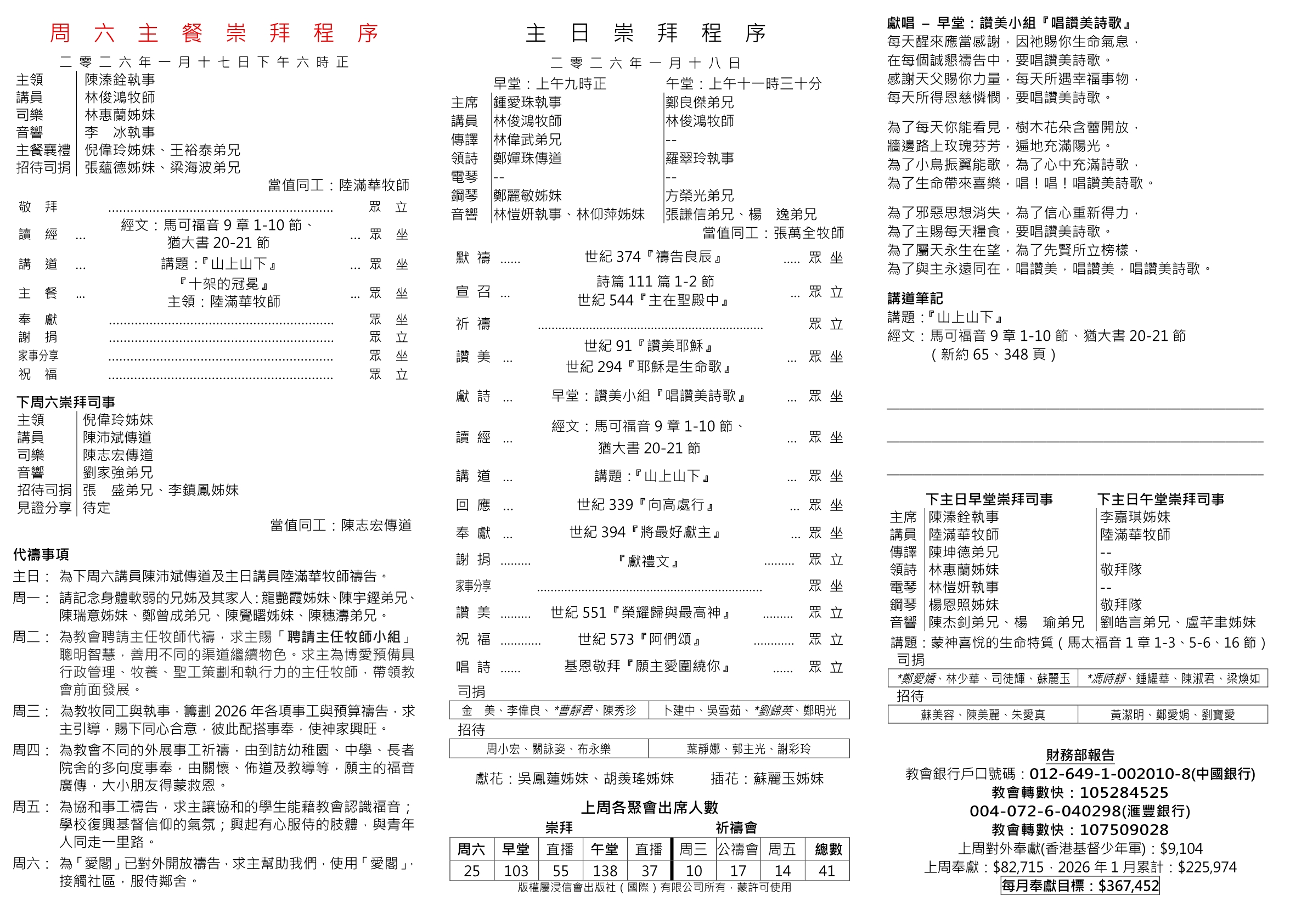 2026年1月18日主日 (早午)堂崇拜程序表