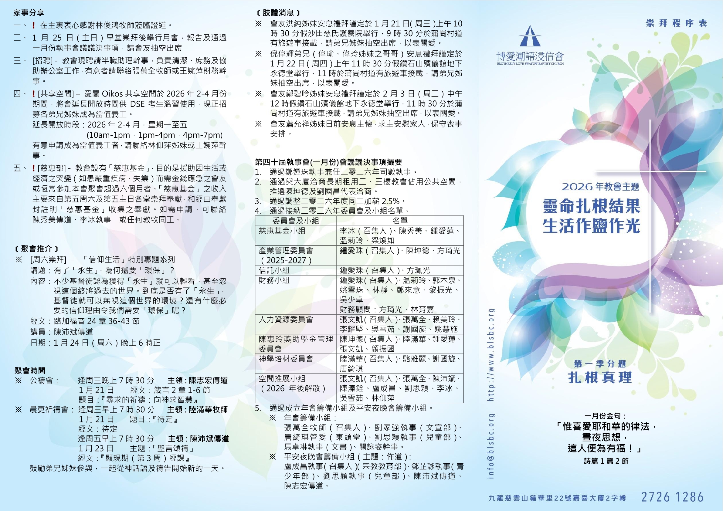 2026年1月18日(早午)堂崇拜,時間:主日早堂:上午九時;午堂:上午十一時三十分