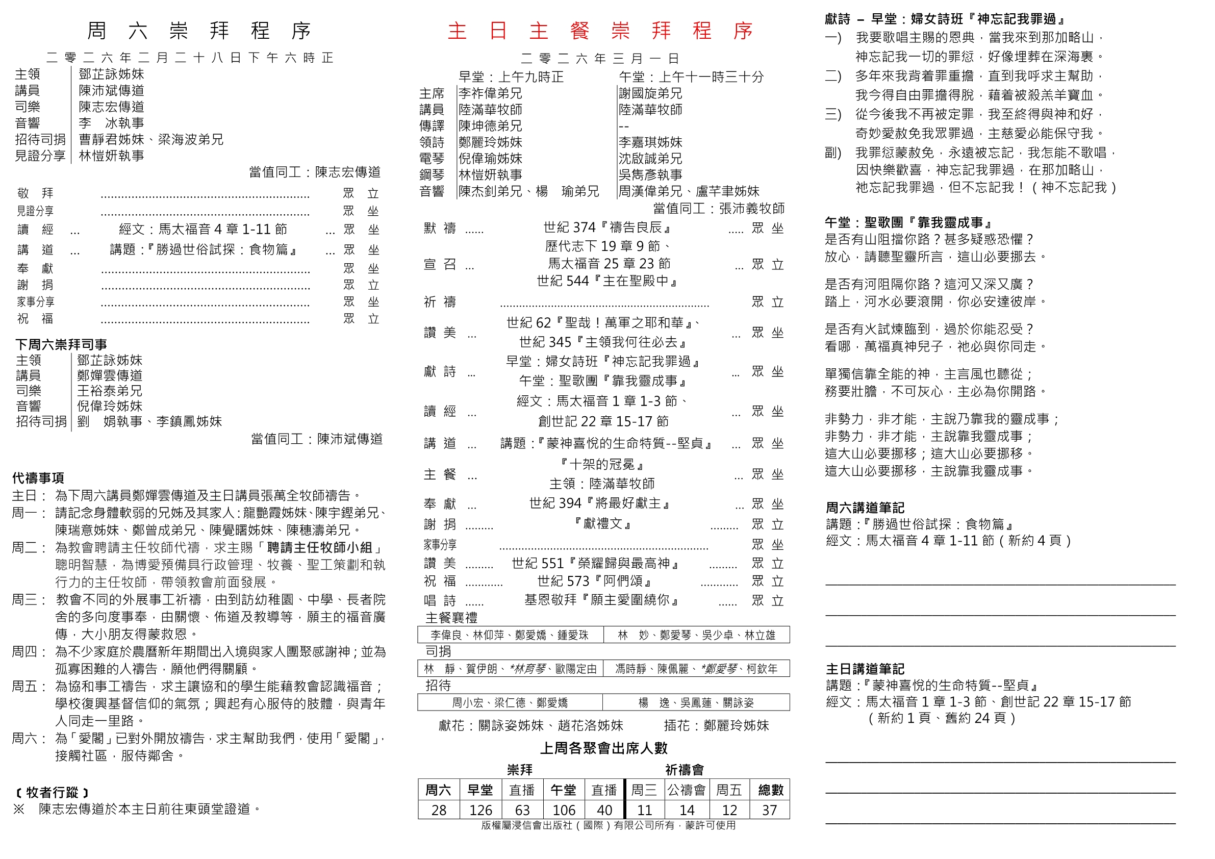 講員:陸滿華牧師 講題:『蒙神喜悅的生命特質--堅貞』 講道經文:馬太福音1章1-3節、創世記22章15-17節 2026年3月1日主日主餐(早午)堂崇拜程序表 2026年3月1日主日主餐 (早午)堂崇拜程序表