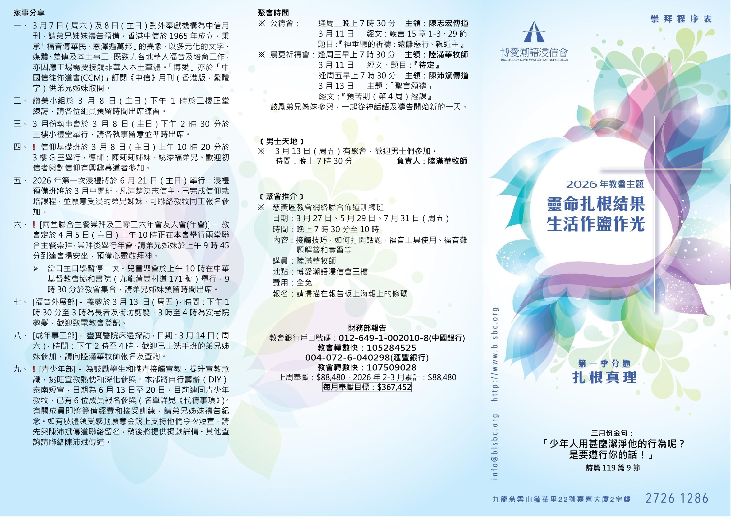 2026年3月8日主日(早午)堂崇拜,時間:主日早堂:上午九時;午堂:上午十一時三十分