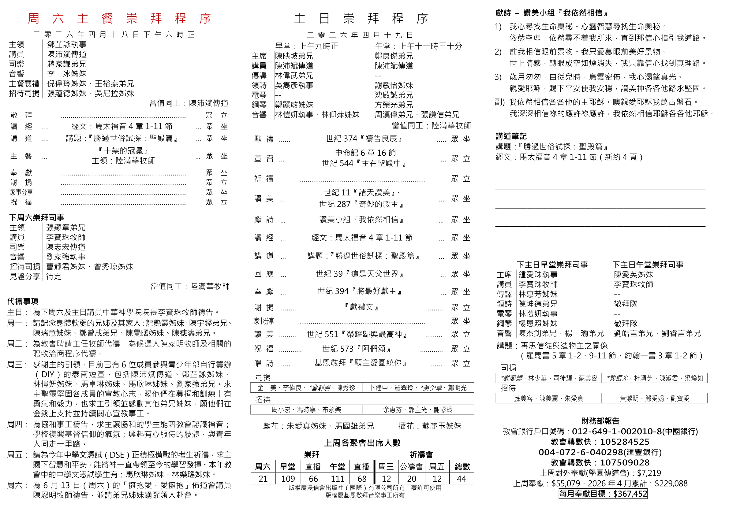 2026年4月19日主日 (早午)堂崇拜,時間:主日早堂:上午九時;午堂:上午十一時三十分